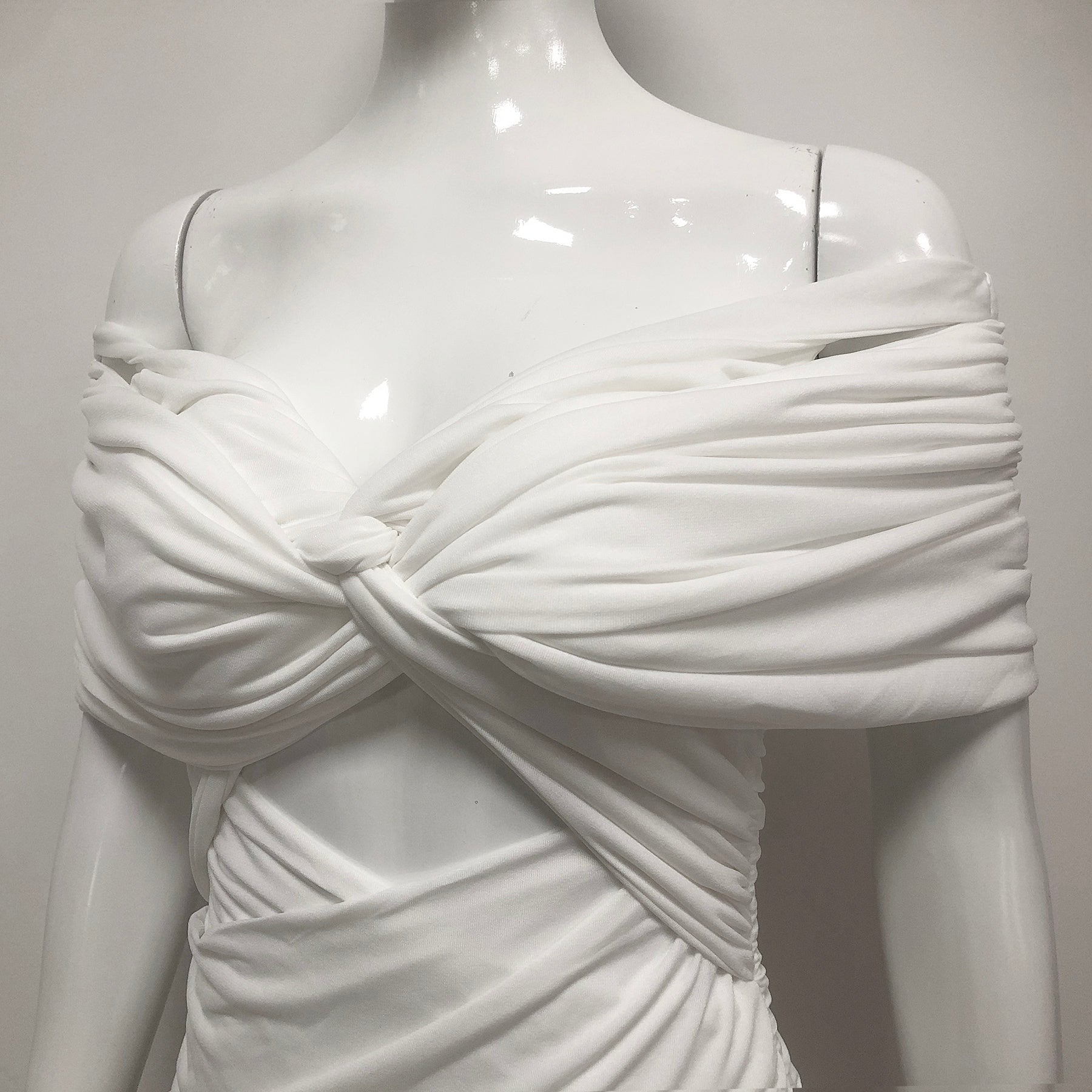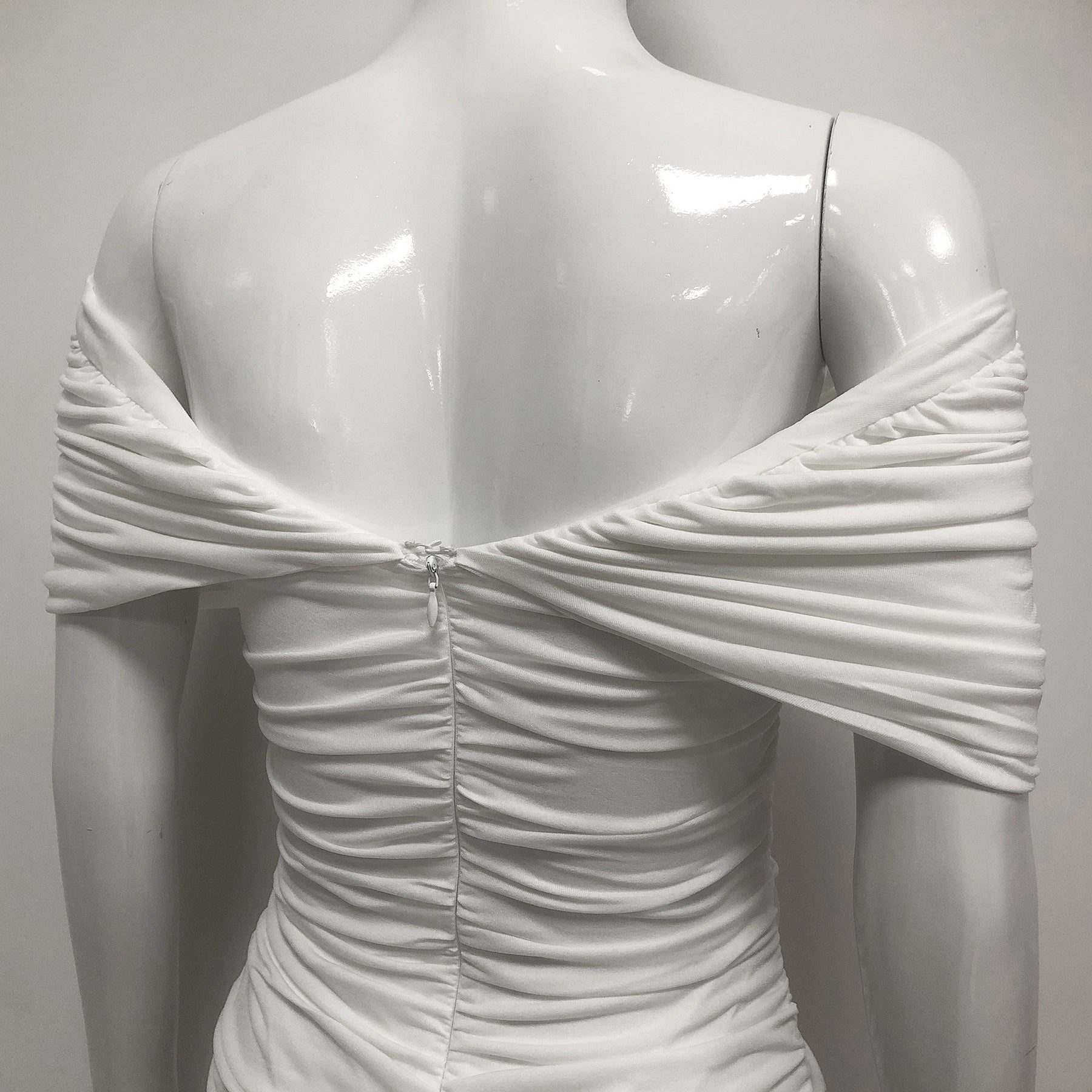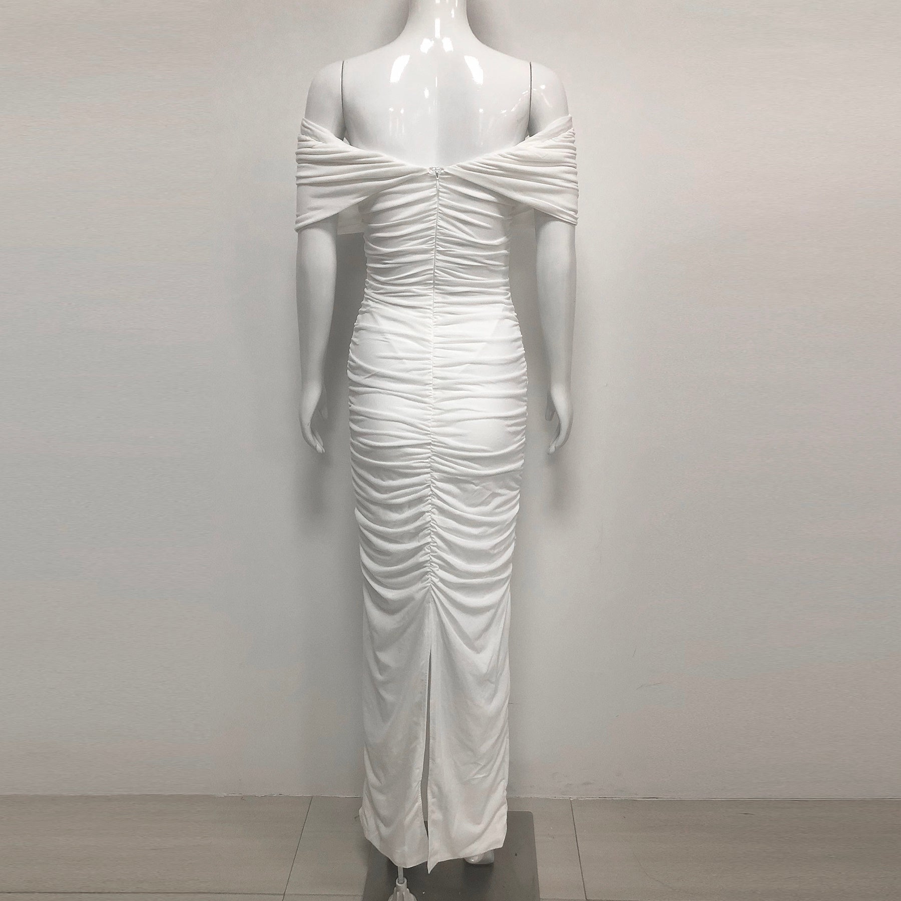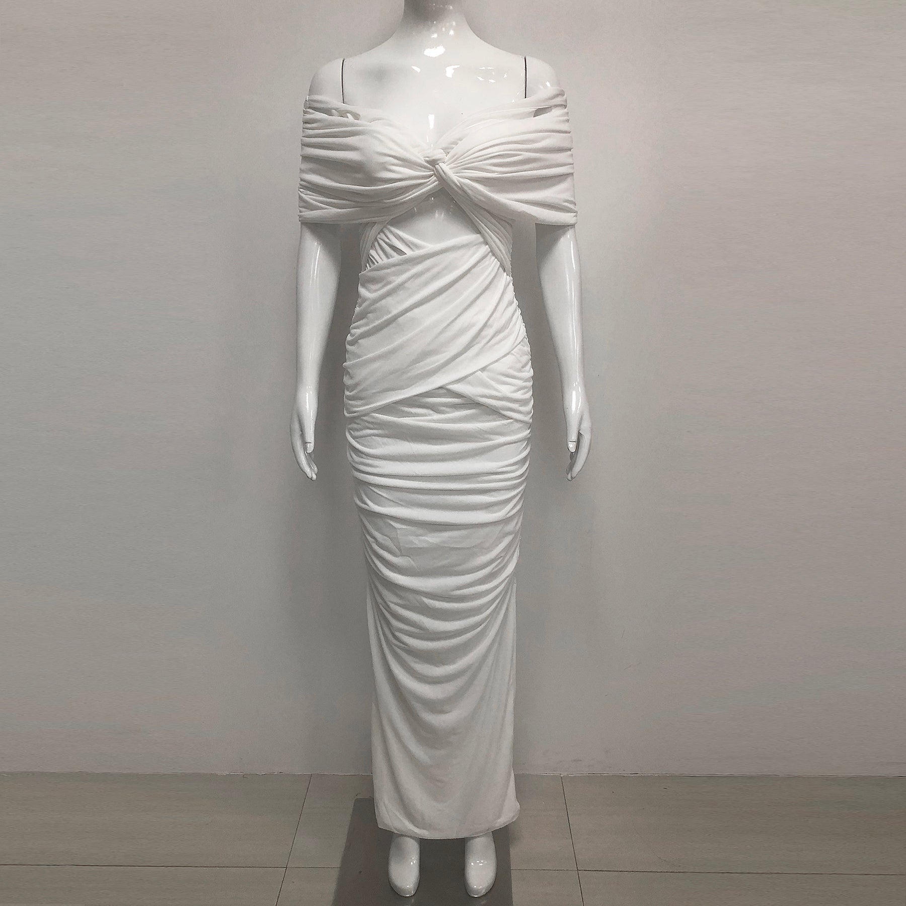 White Off Shoulder Ruched Bodycon Maxi Dresses